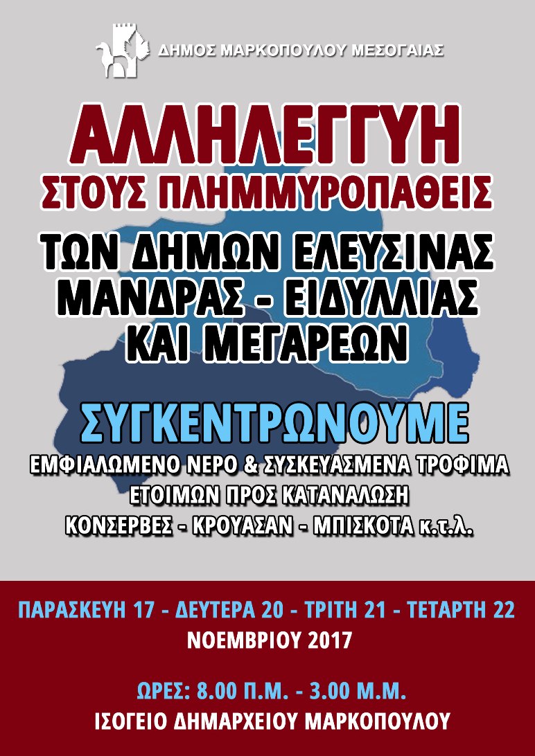 Ο Δήμος Μαρκοπούλου, απευθύνει επείγον κάλεσμα σε όλους μας, για προσφορά Εμφιαλωμένου Νερού και Συσκευασμένων Τροφίμων -έτοιμων προς κατανάλωση- ( Κονσέρβες, Κρουασάν, Μπισκότα κ.λ.π.), αύριο Παρασκευή, 17 Νοεμβρίου 2017 και από την Δευτέρα 20 έως και την Τετάρτη 22 Νοεμβρίου, τις ώρες 8.00 π.μ. έως 3.00 μ.μ, στην είσοδο του Δημαρχείου Μαρκοπούλου, ως αυτονόητη και ελάχιστη κίνηση αλληλεγγύης, για την ενίσχυση των συνανθρώπων μας, που αντιμετωπίζουν έκτακτες ανάγκες, εξαιτίας της καταστροφικής Πλημμύρας που σημειώθηκε, την Τετάρτη 15 Νοεμβρίου, στην Δυτική Αττική.