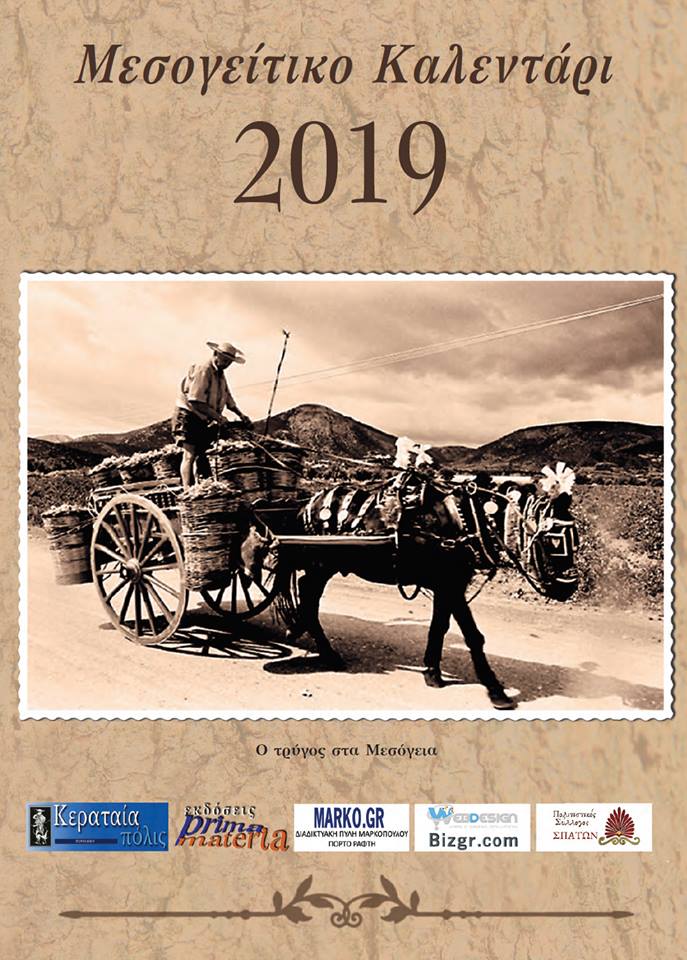 Κυκλοφορεί και εφέτος από τις εκδόσεις Prima Materia το νέο ΜΕΣΟΓΕΙΤΙΚΟ ΚΑΛΕΝΤΑΡΙ του έτους 2019! Όπως κάθε χρόνο έτσι και εφέτος, για πέμπτη συνεχόμενη χρονιά, ετοιμάσαμε με πολύ μεράκι και αγάπη το καθιερωμένο πλέον, ΜΕΣΟΓΕΙΤΙΚΟ ΚΑΛΕΝΤΑΡΙ 2019, ένα ημερολόγιο τοίχου πολύ διαφορετικό απ’ όλα όσα κυκλοφορούν και εντελώς μοναδικό στο είδος του. Με πολύ προσοχή κι άλλο τόσο αίσθημα ευθύνης, επιλέξαμε παλαιές και σπάνιες φωτογραφίες από τα Μεσόγεια που ανακαλούν και ζωντανεύουν η καθεμιά κι ένα κομμάτι της ιστορίας της ιδιαιτέρας πατρίδος μας. Σελίδα την σελίδα και μήνα τον μήνα η ματιά αλλά και η μνήμη μας ταξιδεύει στο νοσταλγικό κι αγαπημένο χθες των Μεσογείων που υπήρξαν από την αρχαιότητα το περιβόλι των θεών.