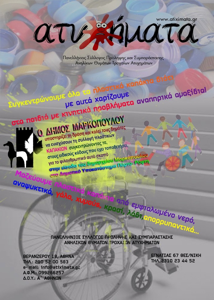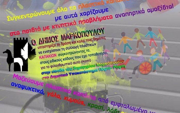 Με μια απλή κίνηση, συγκεντρώνοντας πλαστικά καπάκια από εμφιαλωμένο νερό, αναψυκτικά, γάλα, χυμούς, κρασί, λάδι, απορρυπαντικά και από οποιοδήποτε άλλο προϊόν και τοποθετώντας τα στους ειδικούς κάδους στην είσοδο του Δημαρχείου Μαρκοπούλου και στο Δημοτικό Υποκατάστημα στο Πόρτο Ράφτη, δίνεται η δυνατότητα στον καθένα από εμάς, εύκολα, ανέξοδα και γρήγορα, να συμβάλλει στην προσφορά αναπηρικών αμαξιδίων, στα παιδιά με κινητικά προβλήματα, και παράλληλα, να αναδείξει στην πράξη, τη σημασία της Ανακύκλωσης, με σκοπό να προστατέψουμε το Περιβάλλον μας!