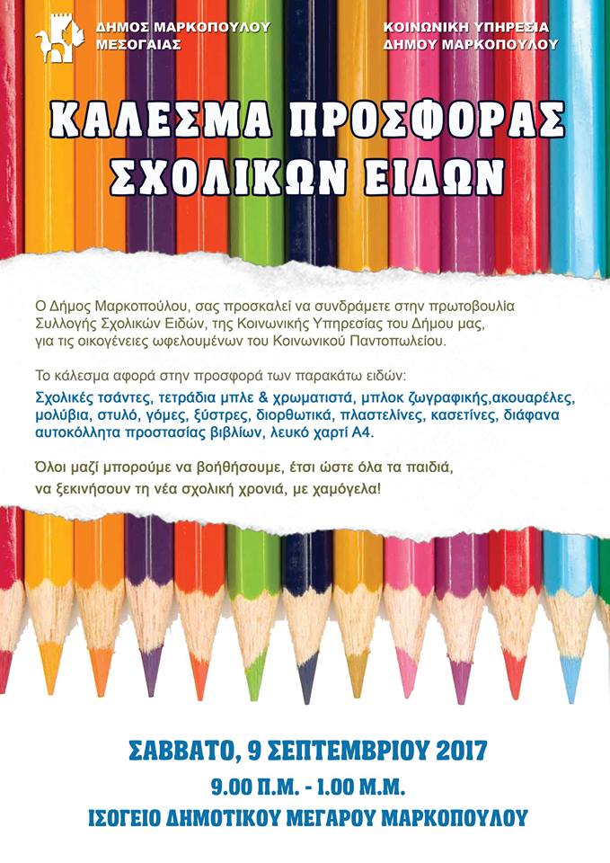Ο Δήμος Μαρκοπούλου, σας προσκαλεί να συνδράμετε την πρωτοβουλία της Κοινωνικής Υπηρεσίας του Δήμου μας, για συλλογή Σχολικών Ειδών, που θα πραγματοποιηθεί το μεθεπόμενο Σάββατο, 9/9/2017 και ώρα 9:00 π.μ. – 1:00 μ.μ., στην είσοδο του Δημαρχείου Μαρκοπούλου.