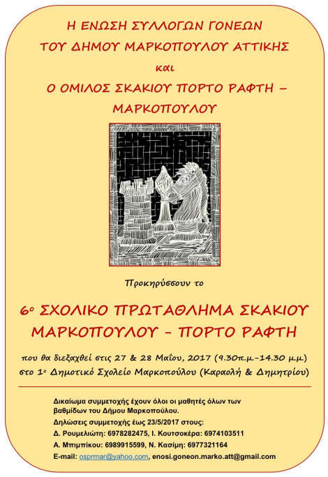 Αυτός ο ισχυρός δεσμός του αθλήματος με τα παιδιά συνεχίζεται με την προκήρυξη του 6ου Σχολικού Πρωταθλήματος Σκακιού που διοργανώνεται από την “Ένωση Συλλόγων Γονέων” του Δ. Μαρκοπούλου και τον “Όμιλο Σκακιού Π. Ράφτη Μαρκ/λου” στις 27 και 28 Μάη 2017, στο 1ο Δημοτικό Σχολείο Μαρκόπουλου (09:30′-14:30′).