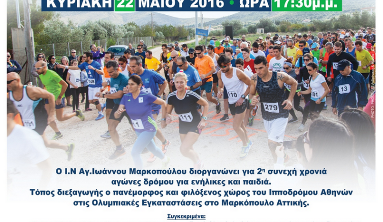 Στις 22 ΜΑΙΟΥ 2016 ημέρα Κυριακή ο Ι.Ν Αγ.Ιωάννου Μαρκοπούλου διοργανώνει για 2η συνεχή χρονιά αγώνες δρόμου για ενήλικες και παιδιά. Τόπος διεξαγωγής ο πανέμορφος και φιλόξενος χώρος του Ιπποδρόμου Αθηνών στις Ολυμπιακές Εγκαταστάσεις στο Μαρκόπουλο Αττικής.