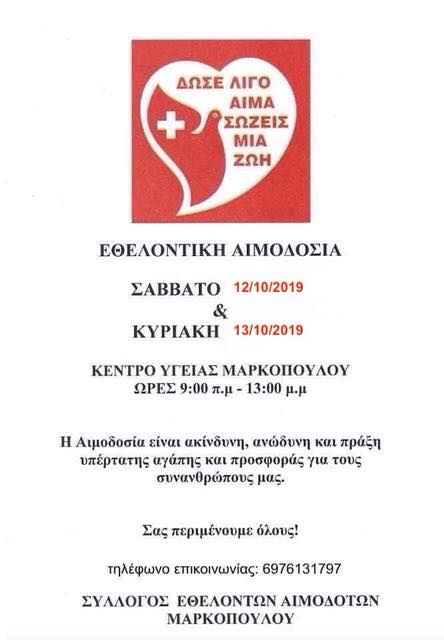 Εθελοντική Αιμοδοσία στον Δήμο Μαρκοπούλου 12-13/10/2019