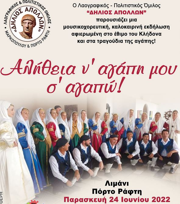 Ο Δήμος Μαρκοπούλου και η Κοινωφελής Δημοτική Επιχείρηση Μαρκοπούλου (Κ.Δ.Ε.Μ.), σας προσκαλούν στην ετήσια μουσικοχορευτική καλοκαιρινή εκδήλωση του Λαογραφικού – Πολιτιστικού Ομίλου Μαρκοπούλου και Πόρτο Ράφτη «Δήλιος Απόλλων» με τίτλο «Αλήθεια ν’ αγάπη μου σ’ αγαπώ», που είναι αφιερωμένη στο έθιμο του Κλήδονα και στα τραγούδια της αγάπης, την Παρασκευή 24 Ιουνίου 2022 και ώρα 21.00 στο λιμάνι του Πόρτο Ράφτη.