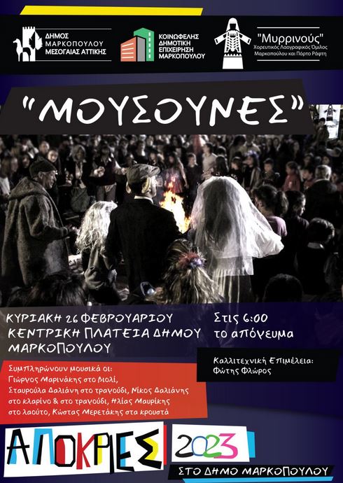 Ο Χορευτικός Λαογραφικός Όμιλος Μαρκοπούλου και Πόρτο Ράφτη «Μυρρινούς», με την υποστήριξη της Κοινωφελούς Δημοτικής Επιχείρησης Μαρκοπούλου (Κ.Δ.Ε.Μ.) και την καλλιτεχνική επιμέλεια του κ. Φώτη Φλώρου, αναβιώνουν ξανά φέτος, το αποκριάτικο έθιμο την Κυριακή 26 Φεβρουαρίου 2023 και ώρα 18.00, ύστερα από τρία χρόνια περιορισμών των εκδηλώσεων.