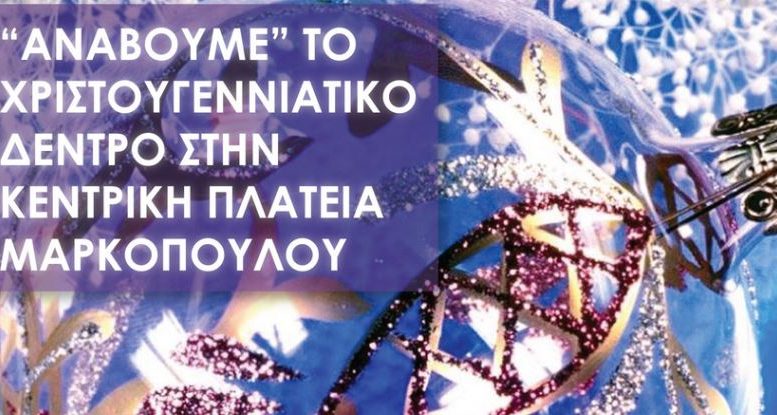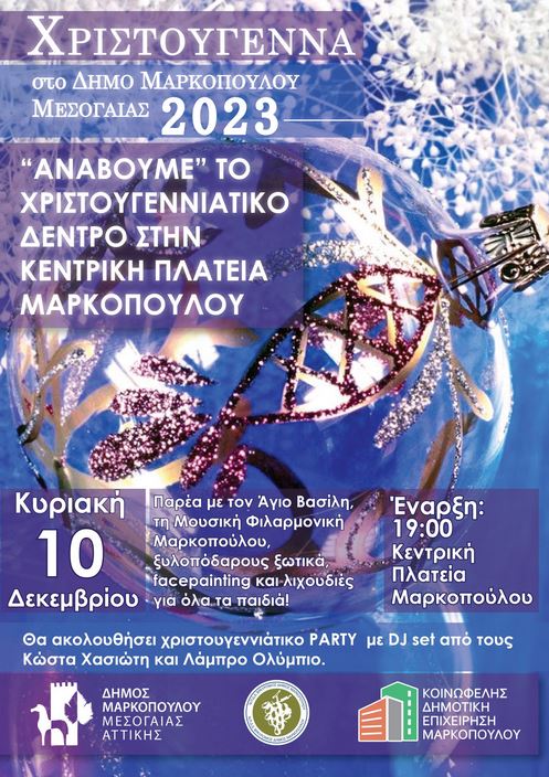 Ο Δήμος Μαρκοπούλου, το Ν.Π.Δ.Δ. «Βραυρώνιος» και η Κοινωφελής Δημοτική Επιχείρηση Μαρκοπούλου (Κ.Δ.Ε.Μ.), σας προσκαλούν στη φωταγώγηση του Χριστουγεννιάτικου Δέντρου, την Κυριακή 10 Δεκεμβρίου 2023 και ώρα 19.00, στην κεντρική πλατεία της πόλης.