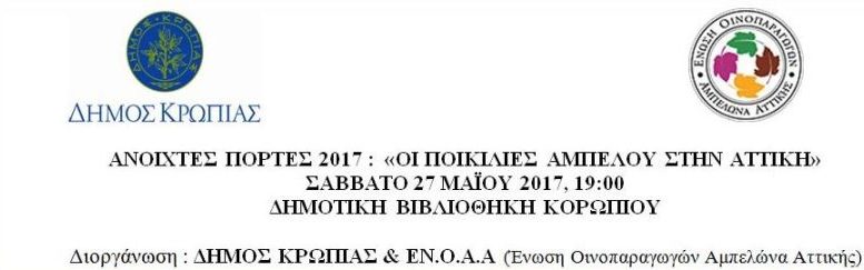 Στο πλαίσιο των οινικών δραστηριοτήτων «Ανοικτές Πόρτες 2017», ο Δήμος Κρωπίας και η Ένωση Οινοπαραγωγών Αμπελώνα Αττικής συνδιοργανώνουν το Σάββατο 27 Μαΐου 2017 στις 7 το απόγευμα στη Δημοτική Βιβλιοθήκη Κορωπίου (πεζόδρομος Γ.Σ Παπασιδέρη 13,κεντρική πλατεία Κορωπίου) εκδήλωση με ομιλητή τον Νικόλαο Δάλπη, γεωπόνο της ΒΙΤΡΟ ΕΛΛΑΣ, με θέμα : «Οι ποικιλίες αμπέλου στην Αττική: Βελτιώσεις και προτάσεις». Την εκδήλωση θα χαιρετίσουν, ο Δήμαρχος Κρωπίας, Δημήτριος Κιούσης και ο πρόεδρος της ΕΝ.Ο.Α.Α, Βασίλης Παπαγιάννης.