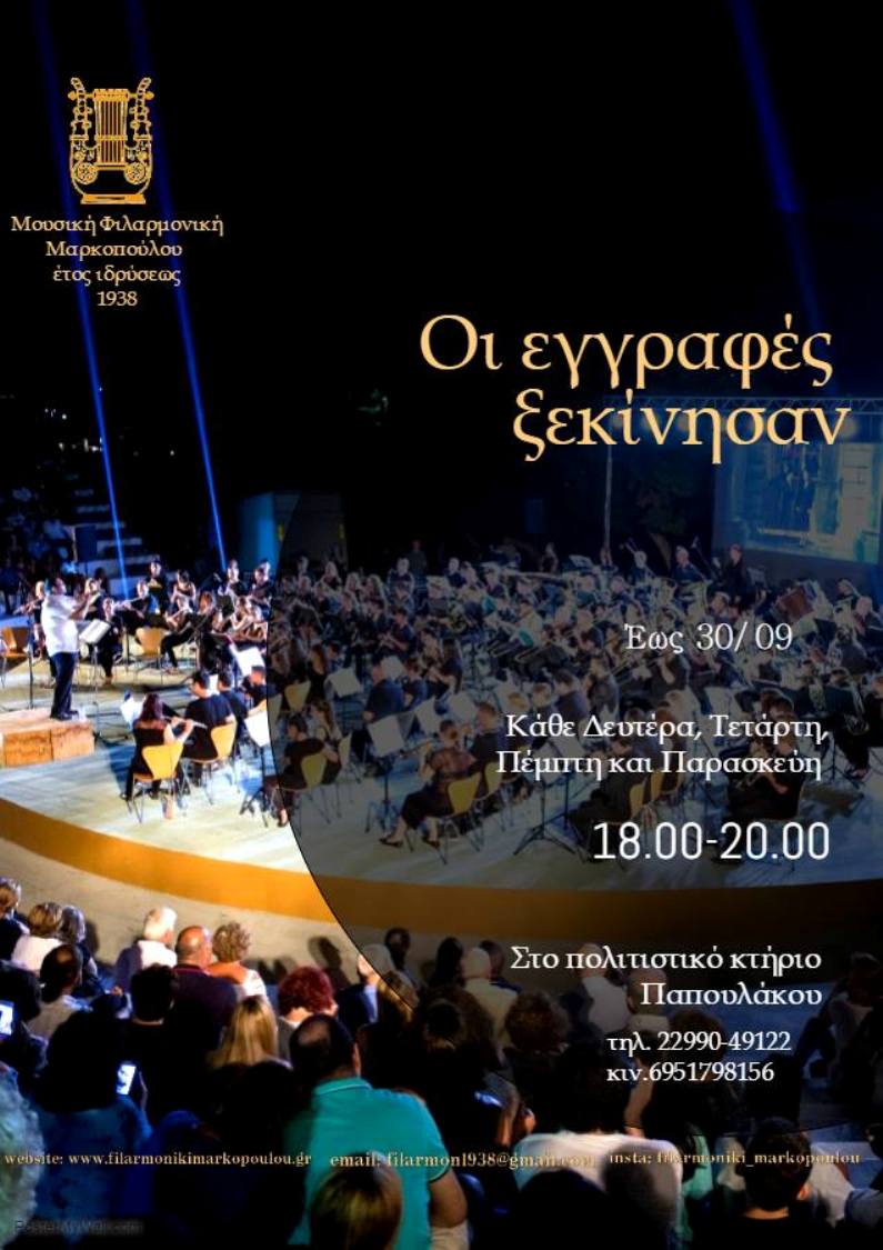 Η Μουσική Φιλαρμονική Μαρκοπούλου γι ακόμη μια χρονιά προσκαλεί τα παιδιά να γίνουν μέλη της μεγάλης της μουσικής οικογένειας. Στη Μουσική Φιλαρμονική Μαρκοπούλου μπορούν να εγγραφούν παιδιά ηλικίας από 7 ετών που επιθυμούν να μάθουν μουσική και στη συνέχεια να επιλέξουν το όργανο πάνω στο οποίο θέλουν να εκπαιδευτούν.
