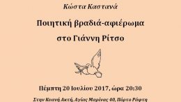 Ποιητική βραδιά-αφιέρωμα στον Γιάννη Ρίτσο την Πέμπτη 20 Ιουλίου 2017, ώρα 20:30 Στην Κυανή Ακτή, Αγίας Μαρίνας 40, Πόρτο Ράφτη από την Θεατρική Ομάδα Πόρτο…