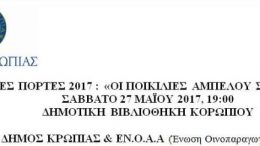 Στο πλαίσιο των οινικών δραστηριοτήτων «Ανοικτές Πόρτες 2017», ο Δήμος Κρωπίας και η Ένωση Οινοπαραγωγών Αμπελώνα Αττικής συνδιοργανώνουν το Σάββατο 27 Μαΐου 2017 στις 7…