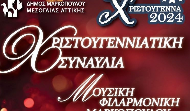 Ο Δήμος Μαρκοπούλου Μεσογαίας σας προσκαλεί στη Χριστουγεννιάτικη Συναυλία της Μουσικής Φιλαρμονικής Μαρκοπούλου την Τρίτη 26 Δεκεμβρίου 2024 και ώρα 20:30 στο Δημοτικό Κινηματοθέατρο «Άρτεμις».