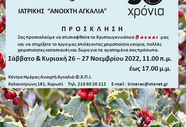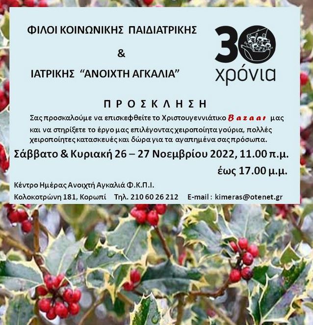 ΧΡΙΣΤΟΥΓΕΝΝΙΑΤΙΚΟ BAZAAR Φίλων Κοινωνικής Παιδιατρικής & Ιατρικής “ΑΝΟΙΧΤΗ ΑΓΚΑΛΙΑ” 18 Νοεμβρίου 2022
