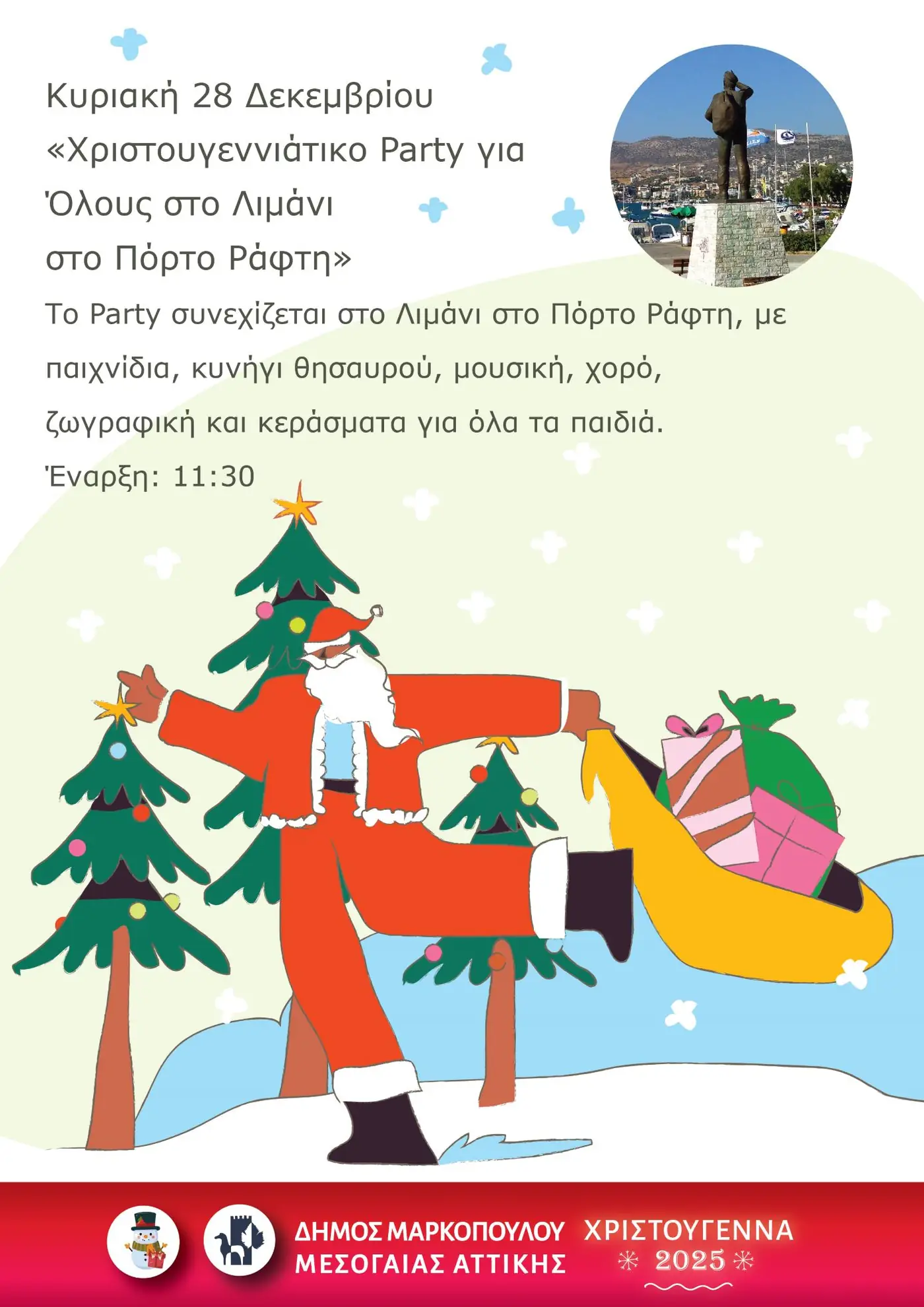 Μετά από την πολύ επιτυχημένη αντίστοιχη εκδήλωση στο Μαρκόπουλο, το Χριστουγεννιάτικο Party συνεχίζεται την Κυριακή 28 Δεκεμβρίου 2025 από τις 11.30 το πρωί στο Λιμάνι στο Πόρτο Ράφτη, με μια ακόμα «ανοιχτή γιορτή», που συμπεριλαμβάνει διαδραστικά παιχνίδια, κυνήγι θησαυρού, μουσική, χορό, ζωγραφική και κεράσματα για όλα τα παιδιά!