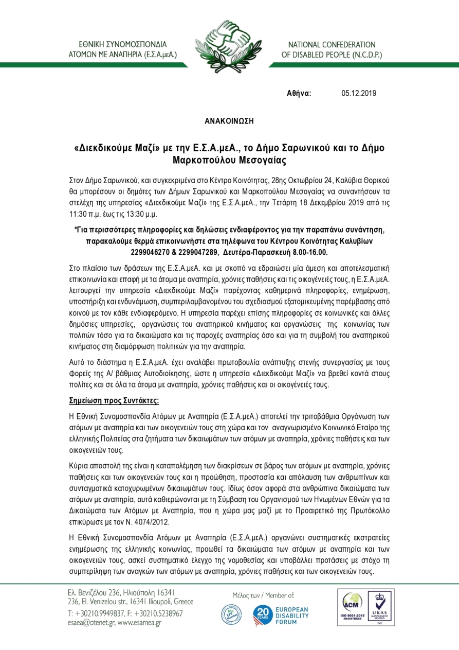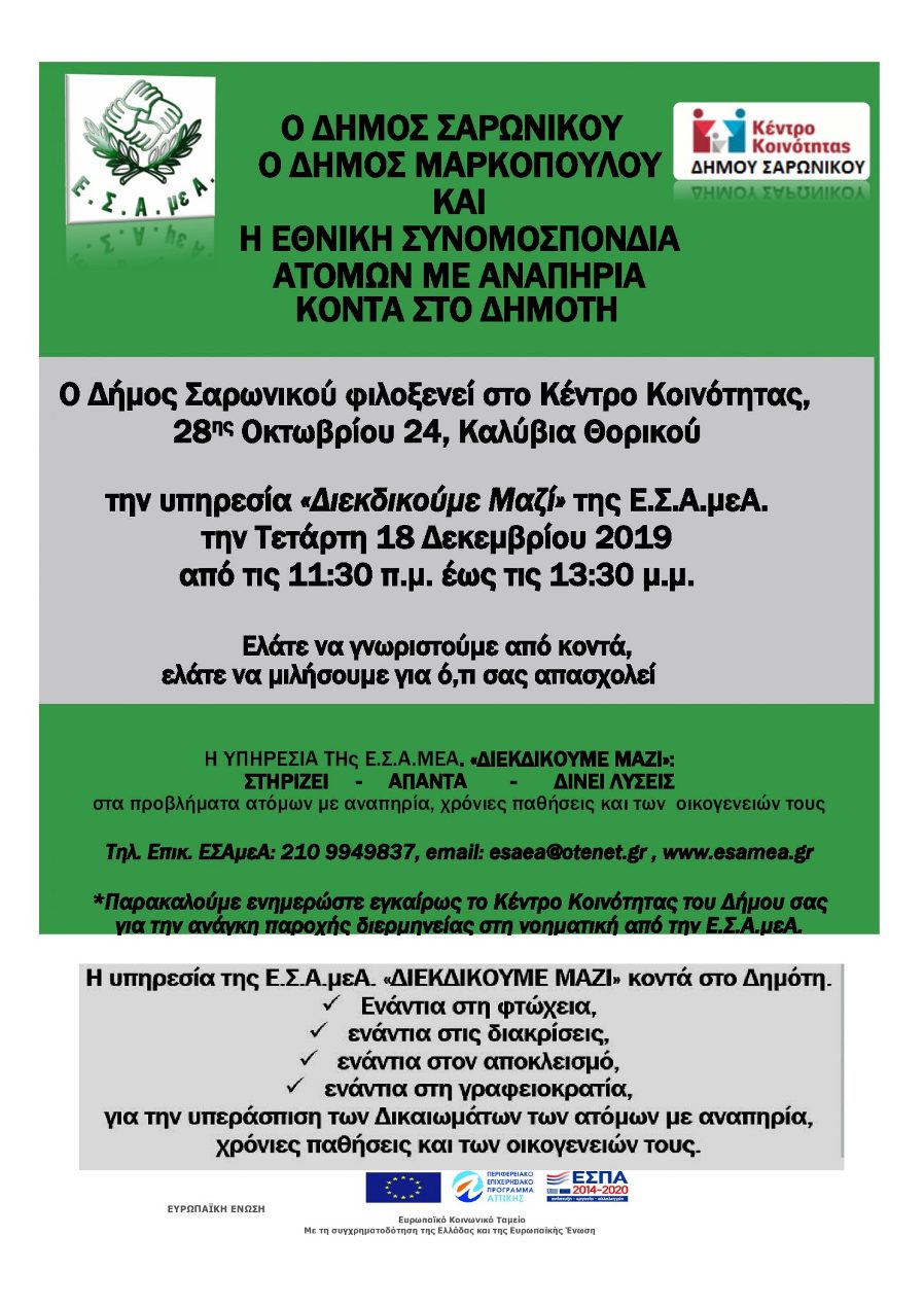 “Διεκδικούμε Μαζί” με την Ε.Σ.Α.μεΑ., το Δήμο Σαρωνικού και το Δήμο Μαρκοπούλου Μεσογαίας 10 Δεκεμβρίου 2019