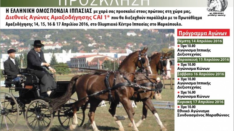 Η Ελληνική Ομοσπονδία Ιππασίας οργανώνει για πρώτη φορά στη χώρα μας Διεθνή Αγώνα στο ανερχόμενο άθλημα της Αμαξοδήγησης. Ο Αγώνας είναι επιπέδου ενός αστέρα – CAI1* και θα διεξαχθεί στο Ολυμπιακό Κέντρο Ιππασίας Μαρκοπούλου, από την Πέμπτη 14 έως και την Κυριακή 17 Απριλίου 2016, παράλληλα με τον Εθνικό Αγώνα Πρωταθλήματος Αμαξοδήγησης.