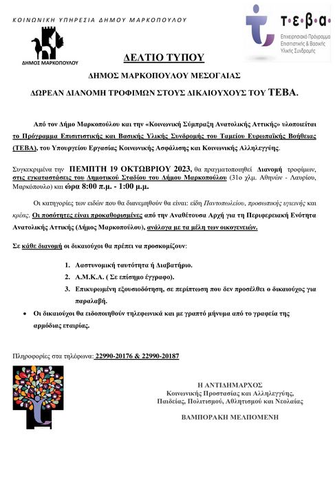 Be the first to comment on "ΔΩΡΕΑΝ ΔΙΑΝΟΜΗ ΤΡΟΦΙΜΩΝ ΣΤΟΥΣ ΔΙΚΑΙΟΥΧΟΥΣ ΤΟΥ ΤΕΒΑ – ΠΕΜΠΤΗ 19/10/2023"