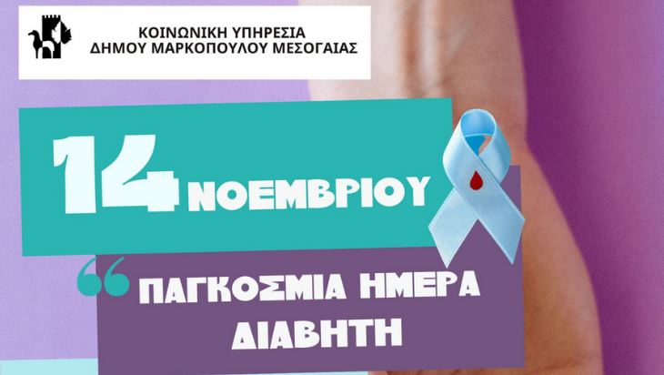 Σε αυτό το πλαίσιο ευαισθητοποίησης και ενημέρωσης η Κοινωνική Υπηρεσία του Δήμου Μαρκοπούλου καλεί το κοινό την Τρίτη 14 Νοεμβρίου 2023, από τις 10.00 π.μ. έως τις 12.00 μ. στο Κοινωνικό Φαρμακείο του Δήμου (4ος όροφος, οδός Παπαδημητρίου 33, Μαρκόπουλο), για να ενημερωθεί για το διαβήτη και όποιος επιθυμεί, να προβεί σε μέτρηση σακχάρου.