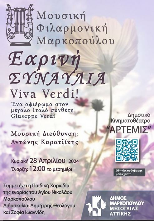 Ο Δήμος Μαρκοπούλου και η Μουσική Φιλαρμονική Μαρκοπούλου, σας προσκαλούν στην Εαρινή Συναυλία που θα πραγματοποιηθεί στο Δημοτικό Κινηματοθέατρο Μαρκοπούλου «Άρτεμις», την Κυριακή των Βαΐων, 28 Απριλίου 2024 και ώρα 12.00 μ.