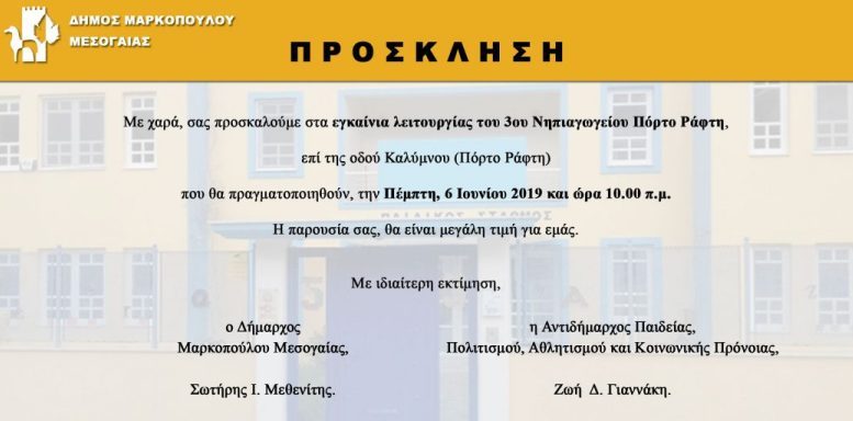 Ο Δήμαρχος Μαρκοπούλου, Σωτήρης Ι. Μεθενίτης και η Αντιδήμαρχος Παιδείας, κα Ζωή Γιαννάκη, σας προσκαλούν στα Εγκαίνια του 3ου Νηπιαγωγείου Πόρτο Ράφτη, που θα πραγματοποιηθούν την Πέμπτη, 6 Ιουνίου 2019 και ώρα 10:00 π.μ., στο νέο χώρο που θα στεγάσει το Σχολείο, επί της οδού Καλύμνου, στο Πόρτο Ράφτη.