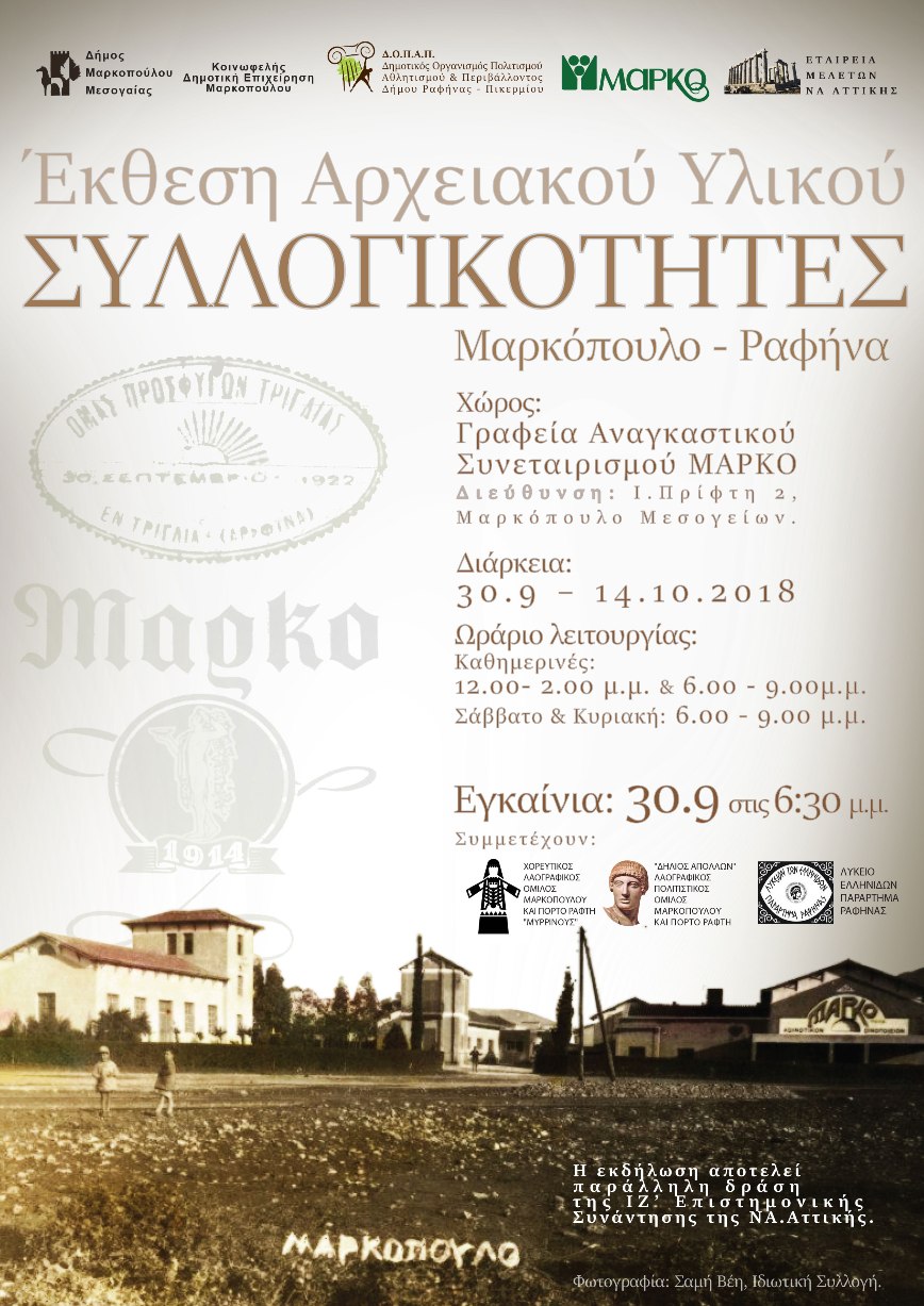 Ο Δήμος Μαρκοπούλου, η Κοινωφελής Δημοτική Επιχείρηση Μαρκοπούλου (Κ.Δ.Ε.Μ.), ο Δημοτικός Οργανισμός Πολιτισμού Αθλητισμού και Περιβάλλοντος Δήμου Ραφήνας – Πικερμίου (Δ.Ο.Π.Α.Π.), ο Αναγκαστικός Συνεταιρισμός «ΜΑΡΚΟ» και η Εταιρεία Μελετών Νοτιοανατολικής Αττικής (Ε.ΜΕ.Ν.Α.), συνδιοργανώνουν και σας προσκαλούν στα εγκαίνια της Έκθεσης Αρχειακού Υλικού με τίτλο «ΣΥΛΛΟΓΙΚΟΤΗΤΕΣ: Μαρκόπουλο – Ραφήνα», που θα πραγματοποιηθούν την Κυριακή, 30 Σεπτεμβρίου 2018 και ώρα 6.30 μ.μ. στα γραφεία του Αναγκαστικού Συνεταιρισμού «ΜΑΡΚΟ» (Ι. Πρίφτη 2, Μαρκόπουλο Μεσογαίας).