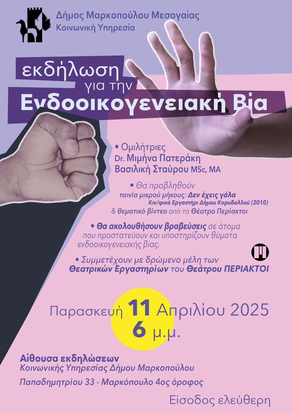 Η εκδήλωση πραγματεύεται ένα σύγχρονο ζήτημα που απασχολεί έντονα την κοινωνία μας τα τελευταία χρόνια και σχετίζεται με τη βίαιη και κακοποιητική συμπεριφορά ενός ατόμου προς άλλο, μέσα στο οικογενειακό περιβάλλον.