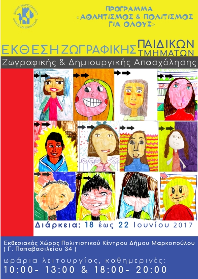 Ο Δήμος Μαρκοπούλου και τα Τμήματα Ζωγραφικής και Δημιουργικής Απασχόλησης του Προγράμματος «Αθλητισμός & Πολιτισμός για Όλους», παρουσιάζουν τα «έργα» της χρονιάς που κλείνει, την Κυριακή, 18 Ιουνίου 2017, στον Εκθεσιακό Χώρο, του Πολιτιστικού Κέντρου του Δήμου Μαρκοπούλου (Γ. Παπαβασιλείου 34).