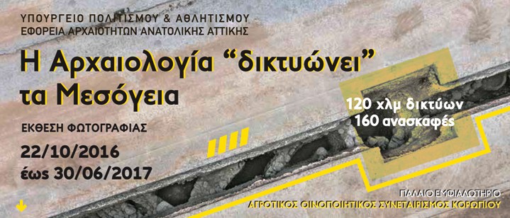 Η έκθεση περιλαμβάνει ενδεικτικό φωτογραφικό υλικό από τις πρόσφατες ανασκαφές της ΕΦΑΑΝΑΤ που εκτελούνται στο πλαίσιο του αρχαιολογικού υποέργου «Αρχαιολογικές έρευνες και εργασίες». Η διενέργεια 160 σωστικών ανασκαφών (2013-2016) στα 120 χλμ. που εκτείνεται το έργο ΕΣΠΑ «Συλλογή, Μεταφορά, Επεξεργασία και Διάθεση Ακαθάρτων περιοχών Κορωπίου-Παιανίας», έφερε στο φως πλήθος αρχαιολογικών θέσεων και ευρημάτων, τα οποία έρχονται να εμπλουτίσουν σημαντικά τις γνώσεις μας για την πεδιάδα των Μεσογείων, μια περιοχή με συνεχή κατοίκηση από την 6η χιλιετία έως και τον 16ο αιώνα μ.Χ.