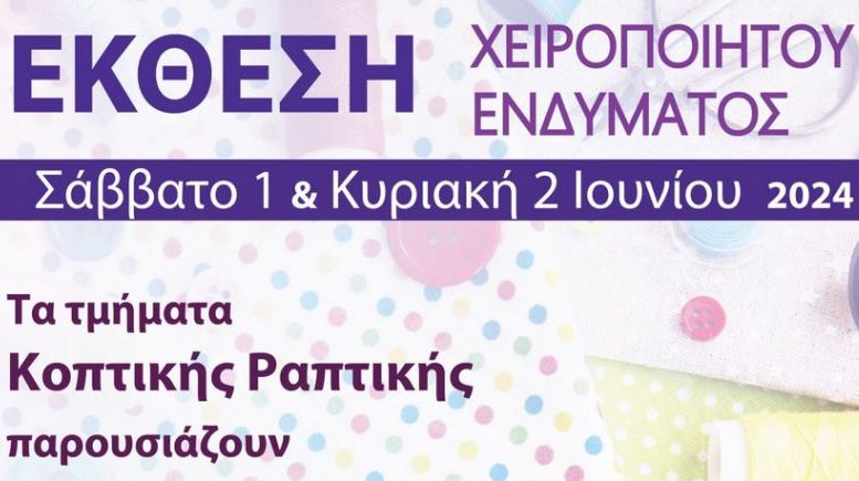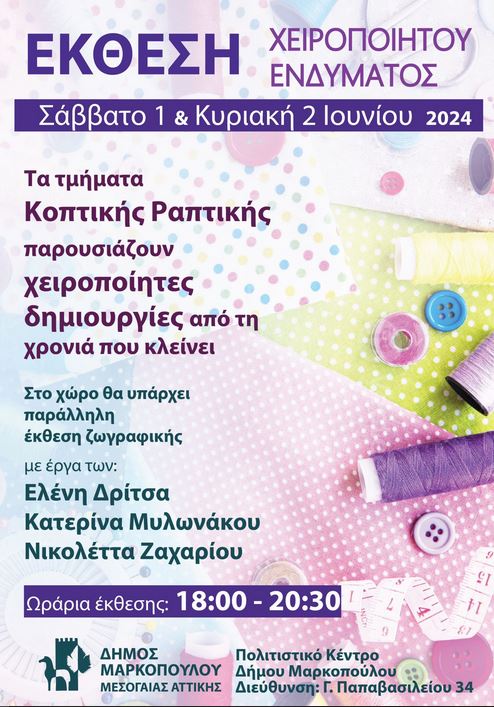 Ο Δήμος Μαρκοπούλου σας προσκαλεί στην Έκθεση Χειροποίητου Ενδύματος των τμημάτων Κοπτικής Ραπτικής του προγράμματος Αθλητισμός και Πολιτισμός του Δήμου Μαρκοπούλου, που θα πραγματοποιηθεί την το Σάββατο 1 και την Κυριακή 2 Ιουνίου 2024, στο Πολιτιστικό Κέντρο του Δήμου Μαρκοπούλου (Γ. Παπαβασιλείου 34).