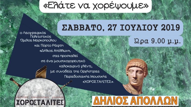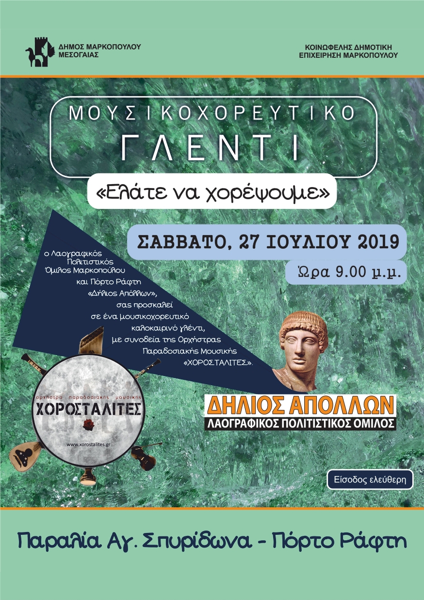 Ο Δήμος Μαρκοπούλου και η Κοινωφελής Δημοτική Επιχείρηση Μαρκοπούλου (Κ.Δ.Ε.Μ.), σας προσκαλούν στο Καλοκαιρινό, Μουσικοχορευτικό Γλέντι του Λαογραφικού και Πολιτιστικού Ομίλου Μαρκοπούλου και Πόρτο Ράφτη «Δήλιος Απόλλων», το Σάββατο 27 Ιουλίου 2019 και ώρα 9:00 το βράδυ, στην παραλία του Αγίου Σπυρίδωνα, στο Πόρτο Ράφτη!