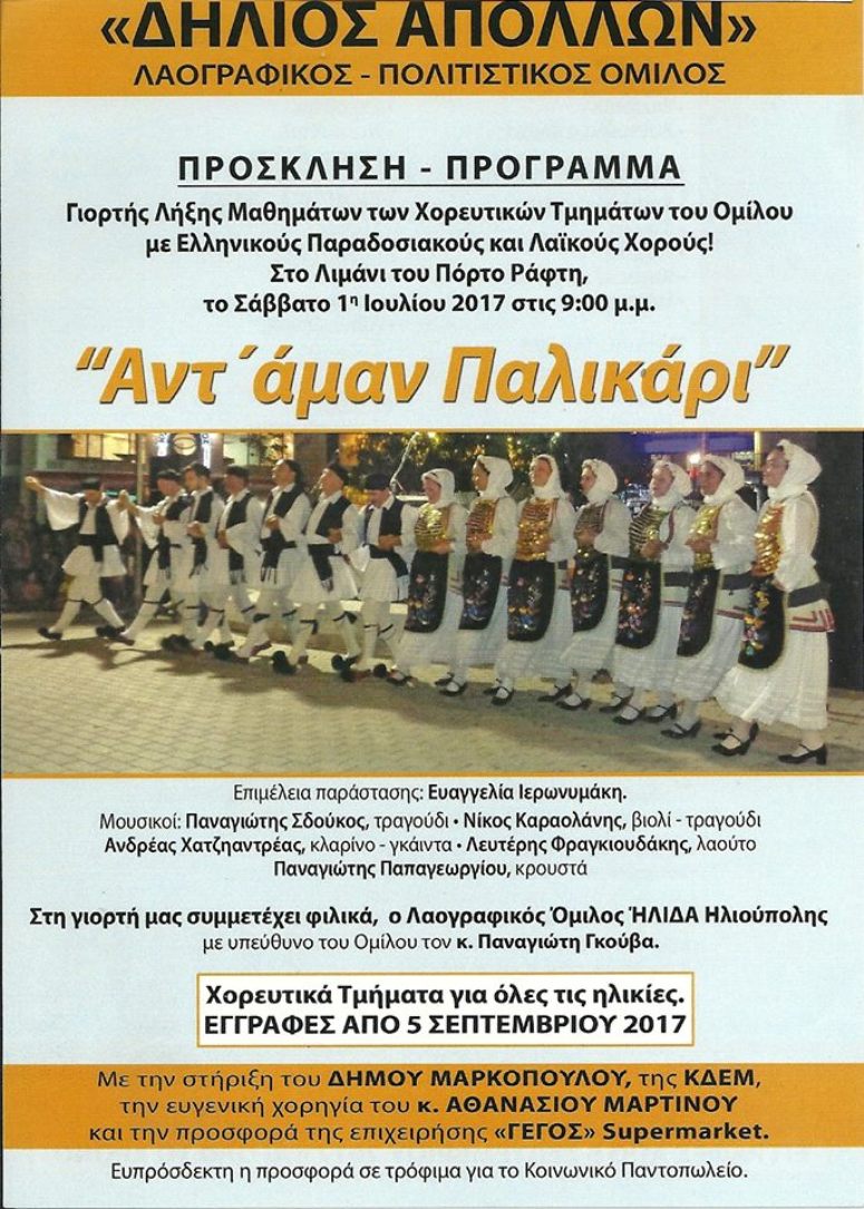 Γιορτή Λήξης Μαθημάτων των Χορευτικών Τμημάτων του Λαογραφικού Πολιτιστικού Ομίλου Μαρκοπούλου & Πόρτο Ράφτη «ΔΗΛΙΟΣ ΑΠΟΛΛΩΝ», με ελληνικούς παραδοσιακούς και λαϊκούς χορούς, που θα πραγματοποιηθεί το Σάββατο 1η Ιουλίου 2017 και ώρα 9:00μ.μ., στο Λιμάνι Πόρτο Ράφτη.