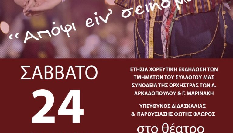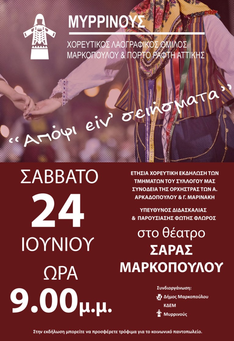 Ετήσια χορευτική εκδήλωση των Τμημάτων του Συλλόγου «ΜΥΡΡΙΝΟΥΣ», με τίτλο: «Απόψι είν’ σειήσματα», το Σάββατο, 24 Ιουνίου 2017 και ώρα 9:00 το βράδυ, στο Θέατρο Σάρας Μαρκοπούλου.