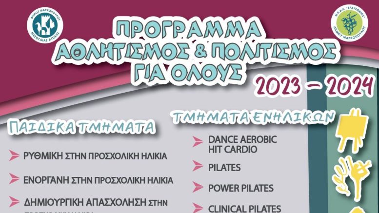Ο Δήμος Μαρκοπούλου και το Ν.Π.Δ.Δ. «ΒΡΑΥΡΩΝΙΟΣ», ανακοινώνουν την έναρξη επανεγγραφών και νέων εγγραφών στο Πρόγραμμα «Αθλητισμός και Πολιτισμός για Όλους» για την περίοδο 2023 – 2024.