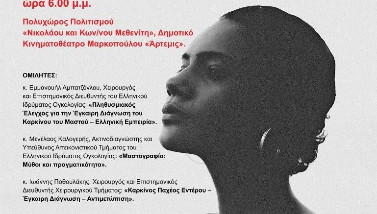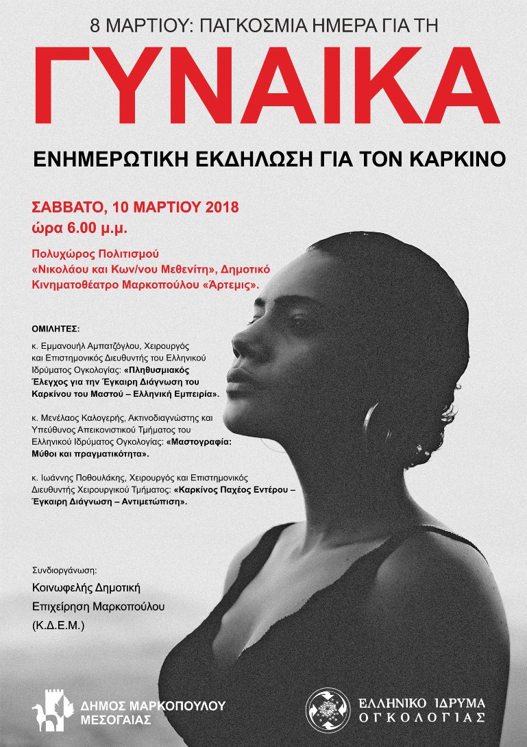 Ο Δήμος Μαρκοπούλου, σε συνεργασία με το «Ελληνικό Ίδρυμα Ογκολογίας» και την Κοινωφελή Δημοτική Επιχείρηση Μαρκοπούλου (Κ.Δ.Ε.Μ.), σας προσκαλεί στην ενημερωτική εκδήλωση για τον καρκίνο, το Σάββατο, 10 Μαρτίου 2018 και ώρα 6.00 μ.μ. στον Πολυχώρο Πολιτισμού «Νικολάου και Κωνσταντίνου Μεθενίτη», στον 1ο όροφο του Δημοτικού Κινηματοθεάτρου Μαρκοπούλου «Άρτεμις».