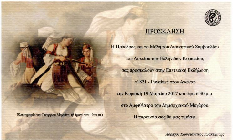 Επετειακή εκδήλωση «1821 – Γυναίκες στον αγώνα» 18 Μαρτίου 2017 ΚΥΡΙΑΚΗ 19 ΜΑΡΤΙΟΥ ΚΑΙ ΩΡΑ 6.30μμ ΣΤΟ ΑΜΦΙΘΕΑΤΡΟ ΔΗΜΑΡΧΙΑΚΟΥ ΜΕΓΑΡΟΥ ΚΟΡΩΠΙΟΥ