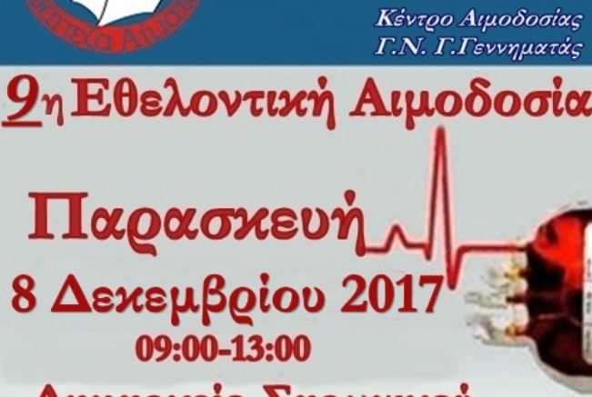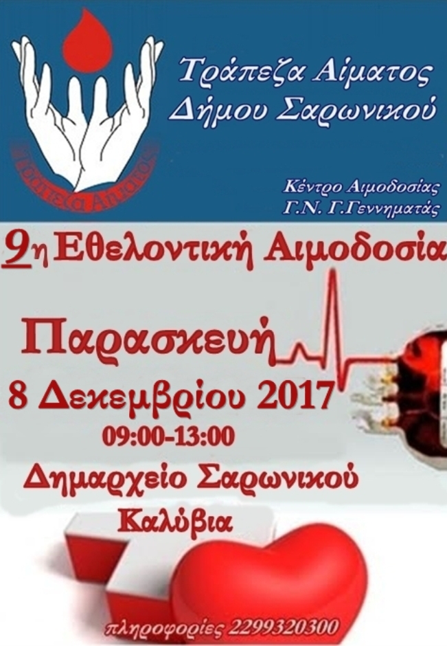 Ο Δήμος Σαρωνικού, στο πλαίσιο των δράσεων με σκοπό τη στήριξη της κοινωνικής αλληλεγγύης και την προαγωγή του εθελοντισμού, διοργανώνει Εθελοντική Αιμοδοσία την Παρασκευή 8 Δεκεμβρίου 2017, για την ενίσχυση της Τράπεζας Αίματος του Δήμου.