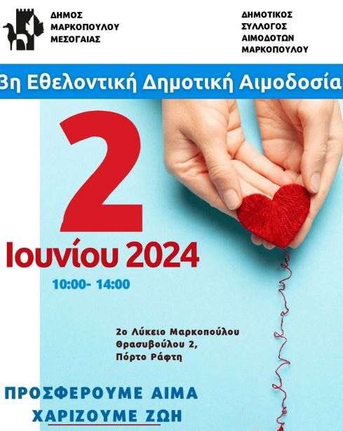Ο Δήμος Μαρκοπούλου σας καλεί να συμμετάσχετε στην 3η εθελοντική Δημοτική Αιμοδοσία, που διοργανώνει ο Δημοτικός Σύλλογος Αιμοδοτών Μαρκοπούλου, σε συνεργασία με το Γενικό Νοσοκομείο Αθηνών «Ο Ευαγγελισμός» και την υποστήριξη της Κοινωνικής Υπηρεσίας του Δήμου, την Κυριακή 2 Ιουνίου 2024, από τις 10.00 το πρωί έως τις 14.00 το μεσημέρι, στις εγκαταστάσεις του νεόδμητου 2ου Λυκείου Μαρκοπούλου, επί της οδού Θρασυβούλου 2, στην περιοχή του Πόρτο Ράφτη.