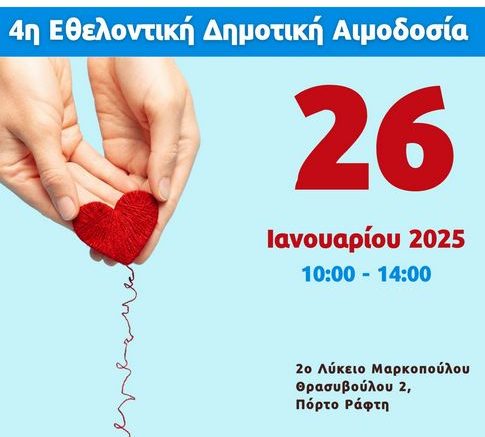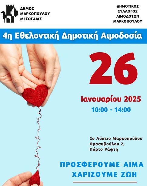 Ο Δήμος Μαρκοπούλου σας καλεί να συμμετάσχετε στην 4η εθελοντική Δημοτική Αιμοδοσία, που διοργανώνει ο Δημοτικός Σύλλογος Αιμοδοτών Μαρκοπούλου, σε συνεργασία με το Γενικό Νοσοκομείο Αθηνών «Ο Ευαγγελισμός» και την υποστήριξη της Κοινωνικής Υπηρεσίας του Δήμου, την Κυριακή 26 Ιανουαρίου 2025, από τις 10.00 το πρωί έως τις 14.00 το μεσημέρι, στις εγκαταστάσεις του 2ου Λυκείου Μαρκοπούλου, επί της οδού Θρασυβούλου 2, στην περιοχή του Πόρτο Ράφτη.
