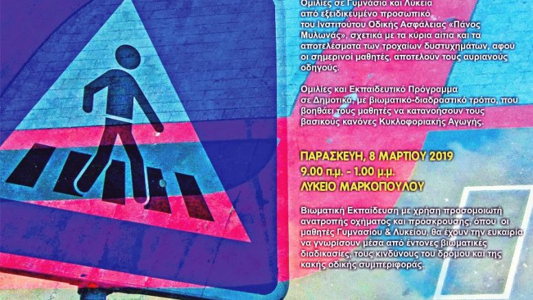 Ομιλίες στο Γυμνάσιο Μαρκοπούλου και στο Λύκειο του Μαρκοπούλου, από εξειδικευμένο προσωπικό του Ινστιτούτου Οδικής Ασφάλειας «Πάνος Μυλωνάς», που θα ενημερώσει και θα συζητήσει με τους μαθητές Γυμνασίου και Λυκείου, τα κύρια αίτια και τα αποτελέσματα των τροχαίων δυστυχημάτων.