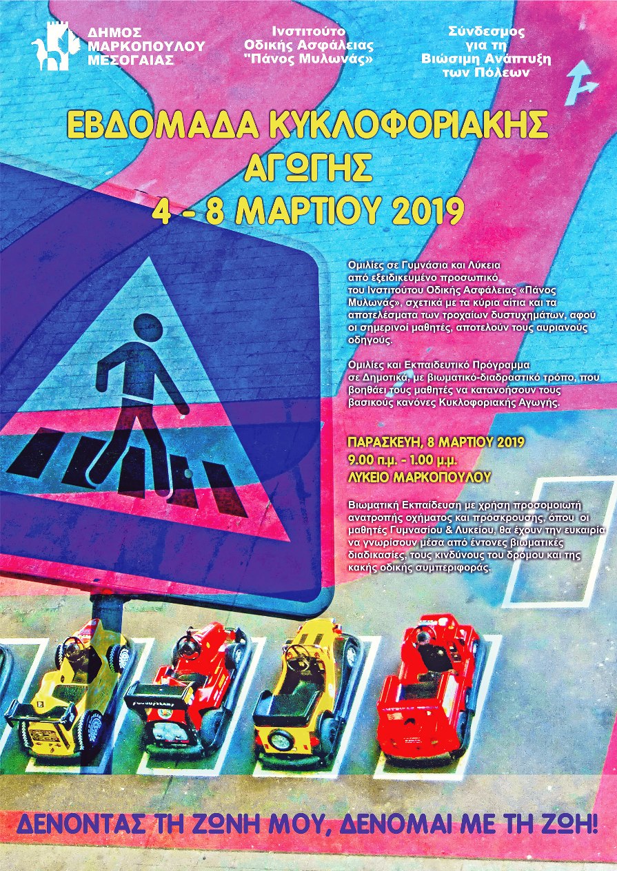 Ο Δήμος Μαρκοπούλου και ο Σύνδεσμος για την Βιώσιμη Ανάπτυξη των Πόλεων, σε συνεργασία με το Ινστιτούτο Οδικής Ασφάλειας «Πάνος Μυλωνάς», διοργανώνουν, Εβδομάδα Κυκλοφοριακής Αγωγής, στα Σχολεία του Δήμου Μαρκοπούλου, με σκοπό την ενημέρωση και ευαισθητοποίηση των μαθητών για την Οδική Ασφάλεια και την Κυκλοφοριακή Αγωγή.