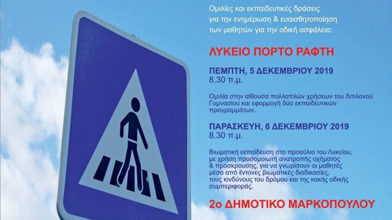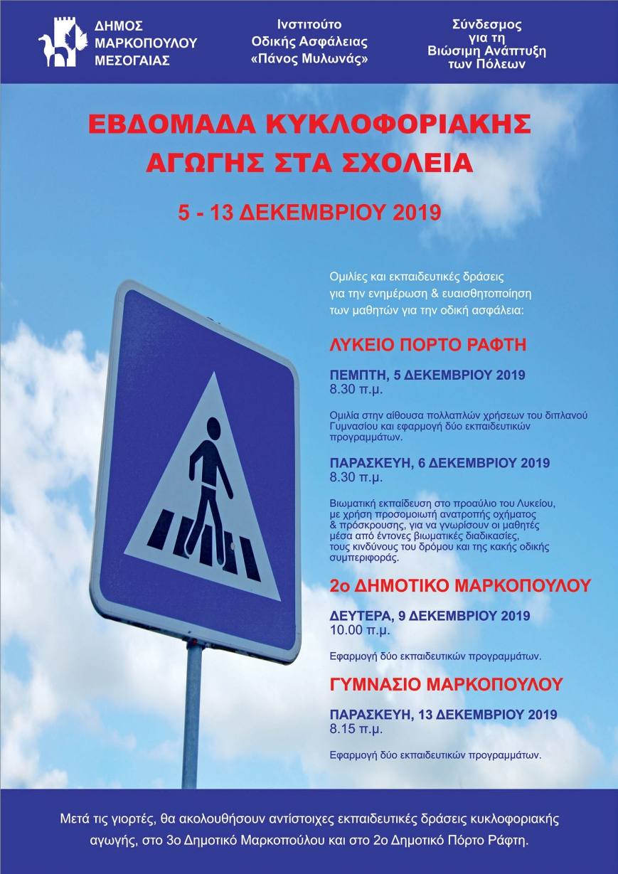 Ο Δήμος Μαρκοπούλου και ο Σύνδεσμος για την Βιώσιμη Ανάπτυξη των Πόλεων, σε συνεργασία με το Ινστιτούτο Οδικής Ασφάλειας «Πάνος Μυλωνάς», διοργανώνουν Εβδομάδα Κυκλοφοριακής Αγωγής το διάστημα 5 – 13 Δεκεμβρίου 2019, στα Σχολεία του Δήμου Μαρκοπούλου, με σκοπό την ενημέρωση και ευαισθητοποίηση των μαθητών για την Οδική Ασφάλεια και την Κυκλοφοριακή Αγωγή.