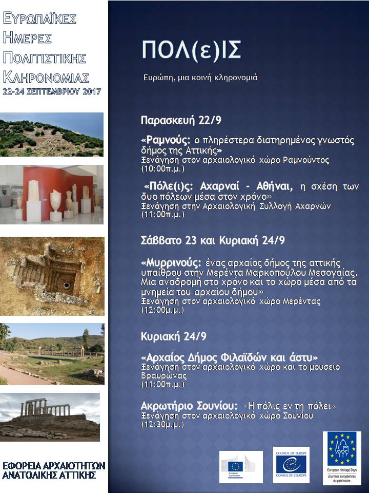 Η Εφορεία Αρχαιοτήτων Ανατολικής Αττικής, συμμετέχοντας στον εορτασμό για τις Ευρωπαϊκές Ημέρες Πολιτιστικής Κληρονομιάς με θέμα «ΠΟΛ(ε)ΙΣ», διοργανώνει θεματικές ξεναγήσεις στους αρχαιολογικούς χώρους Ραμνούντος, Μερέντας Μαρκοπούλου Μεσογαίας, Σουνίου και Βραυρώνας και στην αρχαιολογική συλλογή Αχαρνών, από την Παρασκευή 22 έως και την Κυριακή 24 Σεπτεμβρίου 2017. Συγκεκριμένα θα πραγματοποιηθούν οι ακόλουθες εκδηλώσεις: