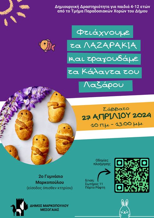 Ο Δήμος Μαρκοπούλου, στο πλαίσιο του μαθήματος Παραδοσιακών Χορών και ενόψει του εορτασμού του Πάσχα, προσκαλεί όλα τα παιδιά ηλικίας 4 – 12 χρονών να συμμετέχουν στην δημιουργική δραστηριότητα: «Φτιάχνουμε τα Λαζαράκια και τραγουδάμε τα Κάλαντα του Λαζάρου».