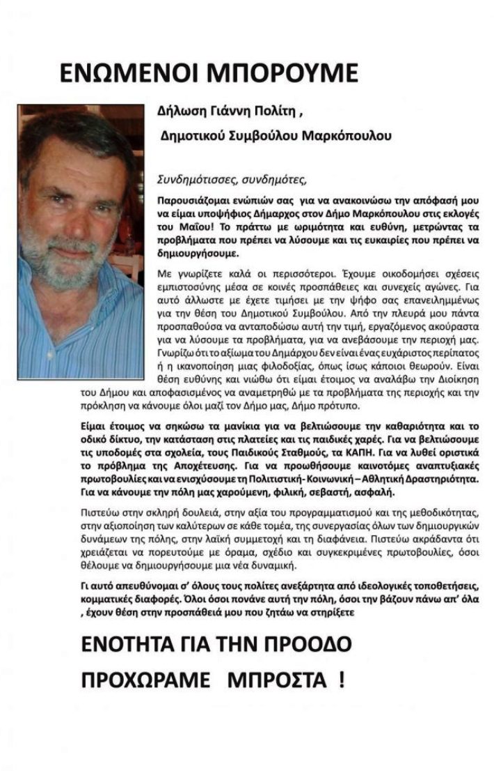 Γιάννης Πολίτης: Υποψήφιος για τον δήμο Μαρκοπούλου