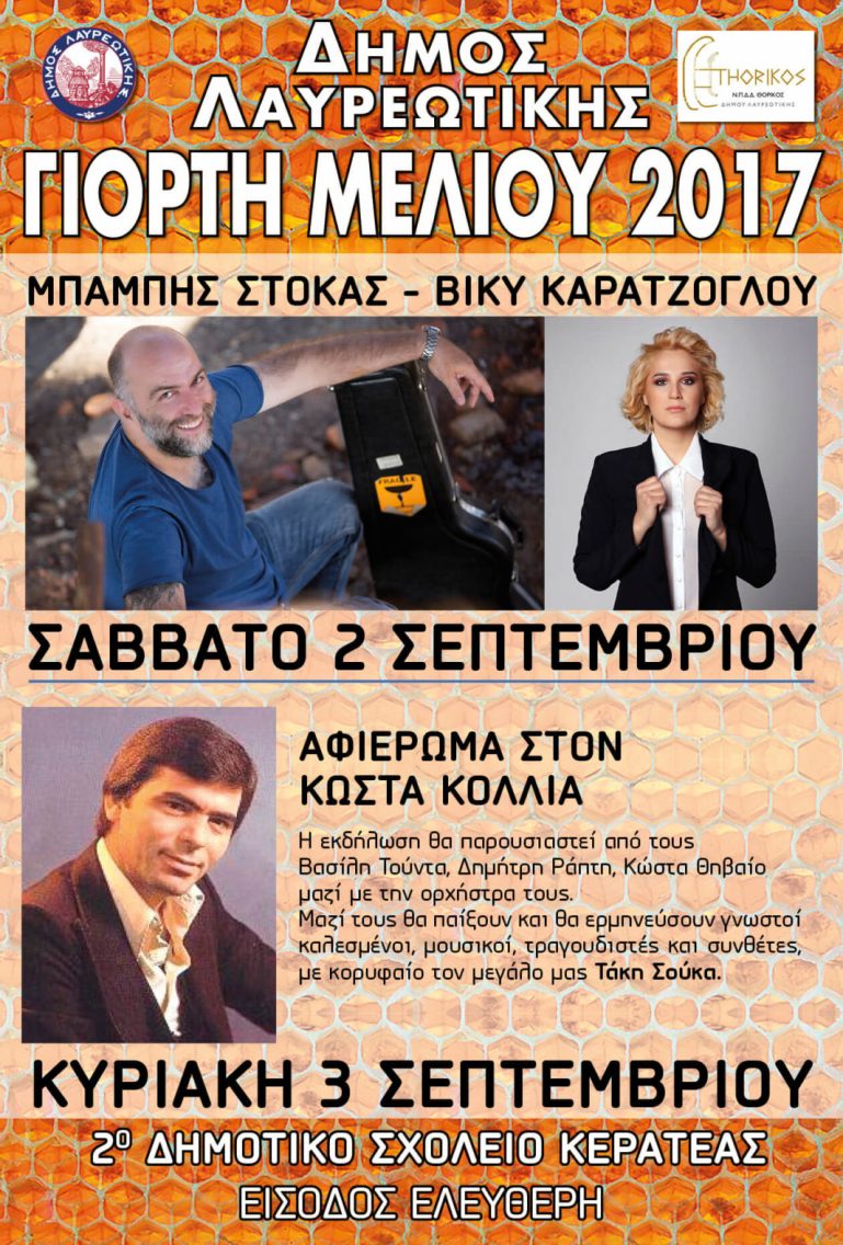 Ο Δήμος Λαυρεωτικής σας προσκαλεί στη Γιορτή Μελιού που θα γίνει 2 & 3 Σεπτεμβρίου, στον προαύλιο χώρο του 2ου Δημοτικού Σχολείου Κερατέας.