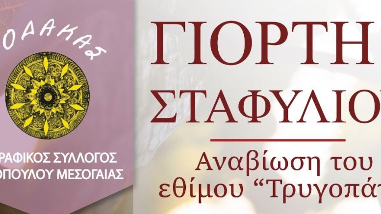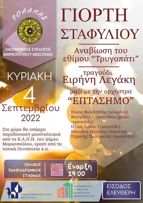 Ο Δήμος Μαρκοπούλου και η Κοινωφελής Δημοτική Επιχείρηση Μαρκοπούλου (Κ.Δ.Ε.Μ.), σας προσκαλούν στη «Γιορτή Σταφυλιού» του Λαογραφικού Συλλόγου Μαρκοπούλου Μεσογαίας «ΡΟΔΑΚΑ», όπου θα αναβιώσει το παραδοσιακό τρυγοπάτι, την Κυριακή 4 Σεπτεμβρίου 2022 και ώρα 19.00, στον Παλαιό Σιδηροδρομικό Σταθμό Μαρκοπούλου.
