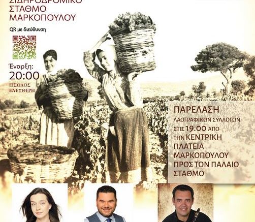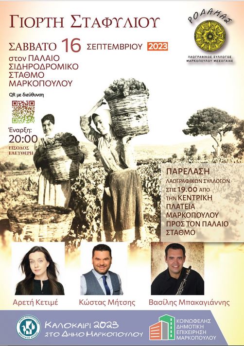 Ο Δήμος Μαρκοπούλου και η Κοινωφελής Δημοτική Επιχείρηση Μαρκοπούλου (Κ.Δ.Ε.Μ.), σας προσκαλούν στη «Γιορτή Σταφυλιού» του Λαογραφικού Συλλόγου Μαρκοπούλου Μεσογαίας «ΡΟΔΑΚΑ», το Σάββατο 16 Σεπτεμβρίου 2023 και ώρα 20.00, στον Παλαιό Σιδηροδρομικό Σταθμό Μαρκοπούλου, όπου θα αναβιώσει το παραδοσιακό τρυγοπάτι.