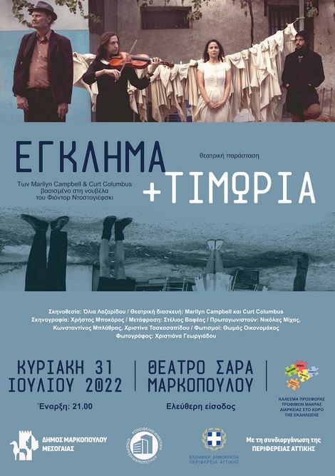 Ο Δήμος Μαρκοπούλου, η Κοινωφελής Δημοτική Επιχείρηση Μαρκοπούλου (Κ.Δ.Ε.Μ.) και η Περιφέρεια Αττικής, συνδιοργανώνουν και σας προσκαλούν στη θεατρική παράσταση «Έγκλημα και Τιμωρία», την Κυριακή 31 Ιουλίου 2022 και ώρα 21.00, στο ανοιχτό θέατρο «Σάρα» Μαρκοπούλου.