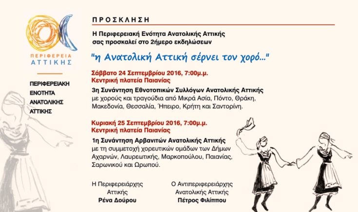 Στο πλαίσιο της προσπάθειας που επιχειρεί η Περιφέρεια Αττικής για στήριξη και ανάδειξη του πολιτισμού και της παράδοσης, αφουγκραζόμενη την ανάγκη των πολιτών για πολιτισμό και ελεύθερη πρόσβαση σε αυτόν, διοργανώνει διήμερη χορευτική συνάντηση στις 24 και 25 Σεπτεμβρίου στην Περιφερειακή Ενότητα Ανατολικής Αττικής, στην κεντρική πλατεία Παιανίας (αύλειος χώρος Ι.Ν. Ζωοδόχου Πηγής) με τίτλο «Η Ανατολική Αττική σέρνει τον χορό…».