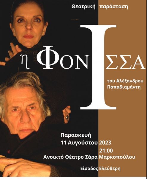 Ο Δήμος Μαρκοπούλου, η Κοινωφελής Δημοτική Επιχείρηση Μαρκοπούλου (Κ.Δ.Ε.Μ.) και η Περιφέρεια Αττικής, σας προσκαλούν στην θεατρική παράσταση «Η Φόνισσα», την Παρασκευή 11 Αυγούστου 2023 και ώρα 21.00 στο Ανοιχτό Θέατρο Σάρα Μαρκοπούλου.
