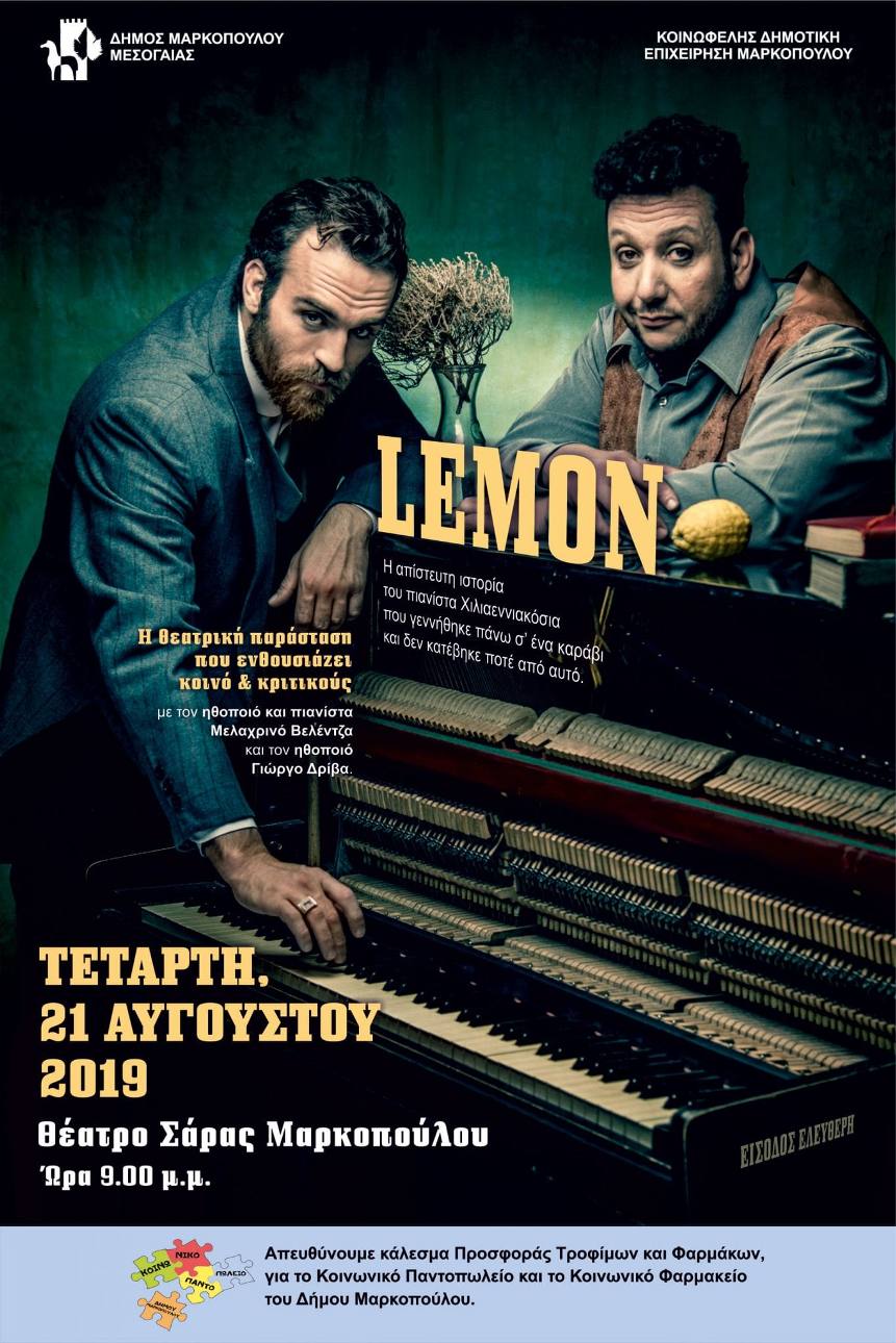 Ο Δήμος Μαρκοπούλου και η Κοινωφελής Δημοτική Επιχείρηση Μαρκοπούλου (Κ.Δ.Ε.Μ.), σας προσκαλούν, στην Θεατρική Παράσταση «LEMON», την Τετάρτη 21 Αυγούστου 2019 και ώρα 9 μ.μ., στο Θέατρο Σάρας Μαρκοπούλου.